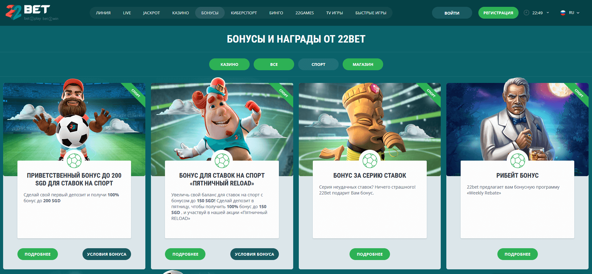 Бонусы спорт 22Бет